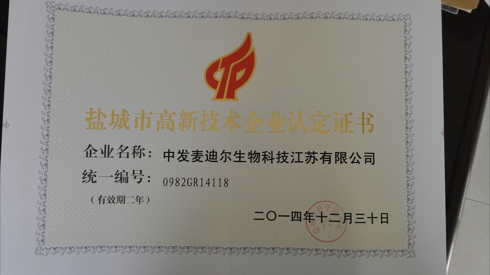 “盐城市高新技术企业”证书 2014年12月公司被盐城市科技技术局认定为“盐城市高新技术企业”。……